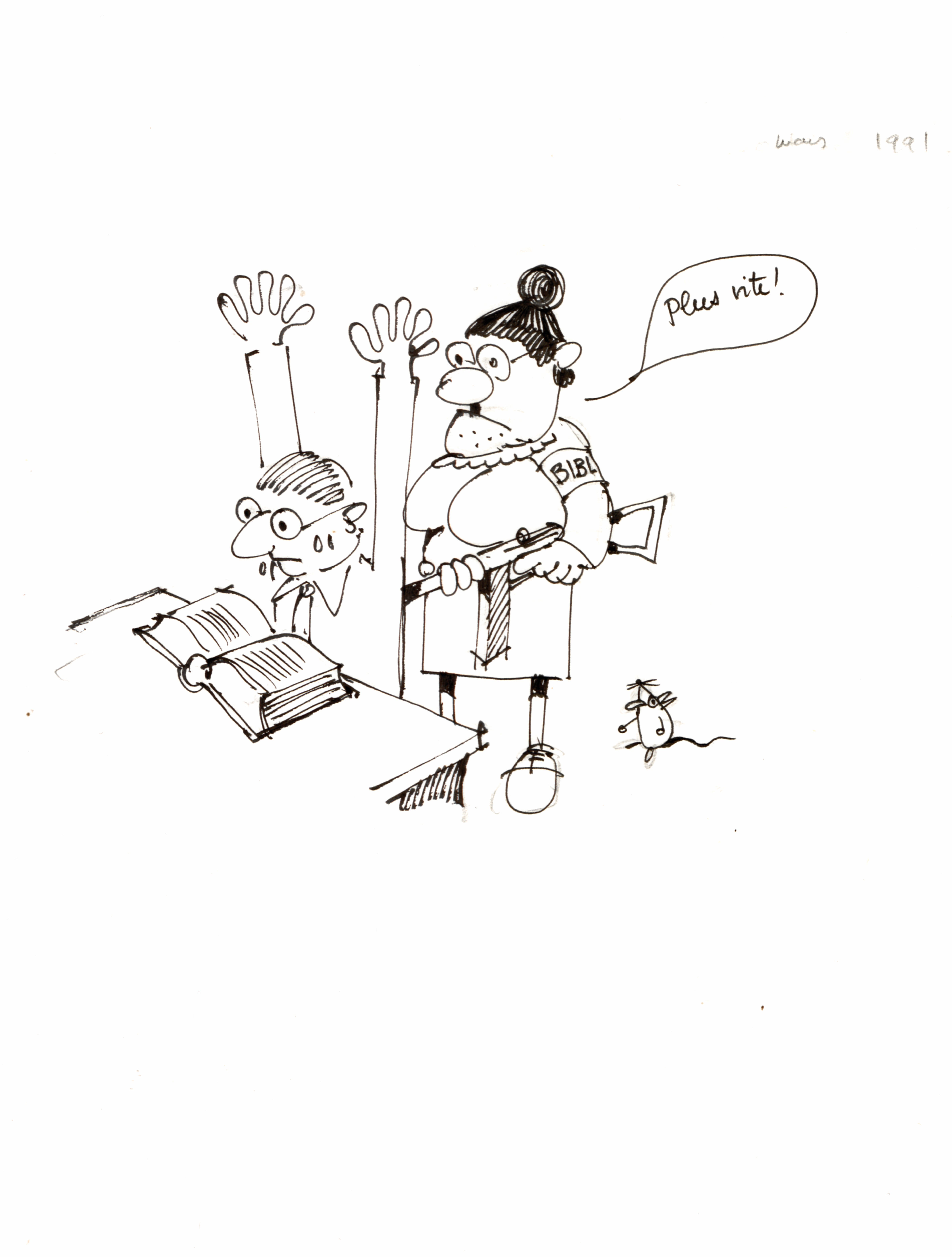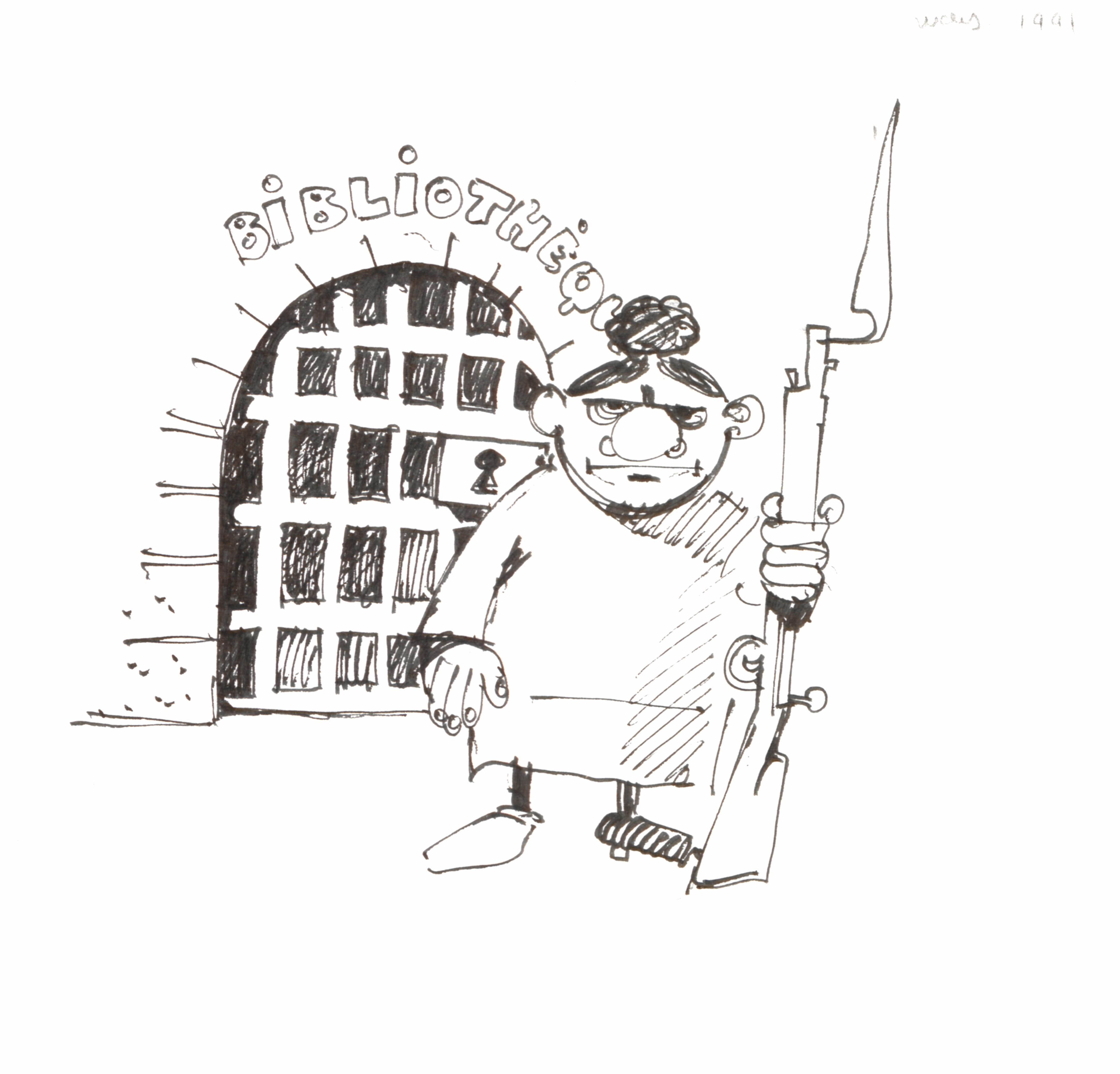 Les bibliothécaires s'arrachent les cheveux pour choisir les numéros de périodiques parus (d'où la perruque à chignon) ; se battent pour obtenir des budgets ; envoient des mails aux quatres coins du monde ; font et défont des paquets pour les échanges d'ouvrages ; coupent, découpent et recollent ; encadrent des stagiaires ; arpentent les réserves en se creusant la tête pour faire de la place ; déplacent des étagères... Et, oui, avouons-le, font aussi une pause café, le temps de récupérer et de refaire leur chignon !